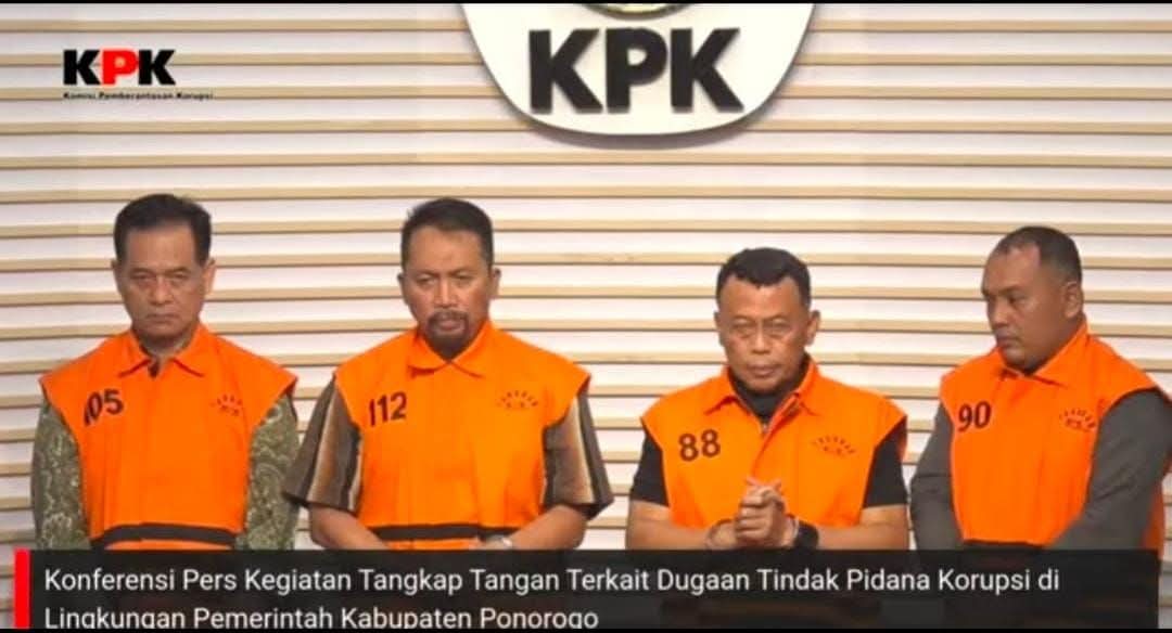 “Yang kemudian setelah ditemukan kecukupan alat bukti, KPK menetapkan 4 orang sebagai tersangka, yakni Saudara SUG selaku Bupati Ponorogo periode 2021-2025 dan 2025-2030, Saudara AGP selaku Sekretaris Daerah,